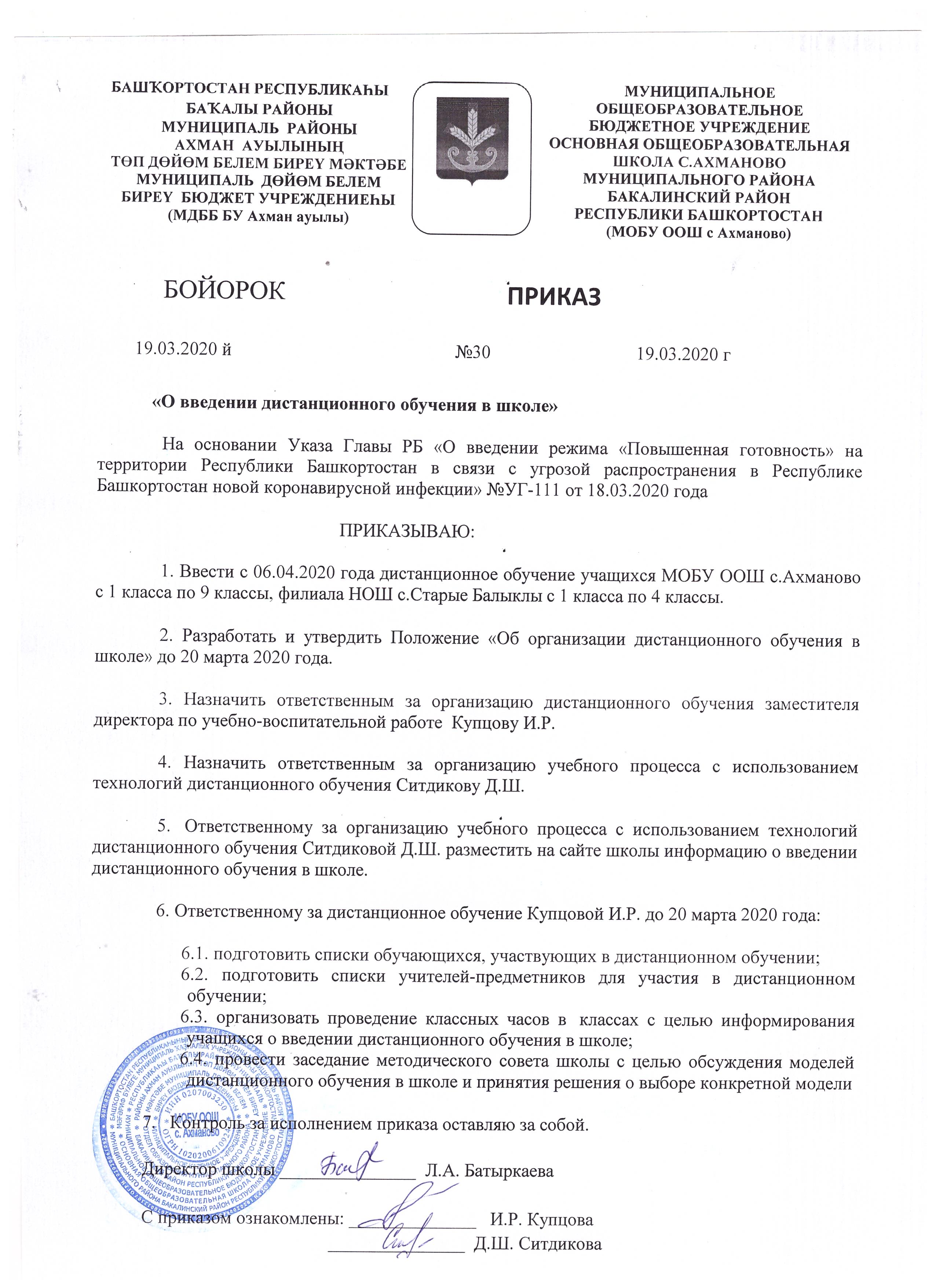 Приказ о переходе на дистанционное обучение в школе | 19.03.2020 | Зам пр УВР Купцова И.Р Директор Батыркаева Л.А. | |