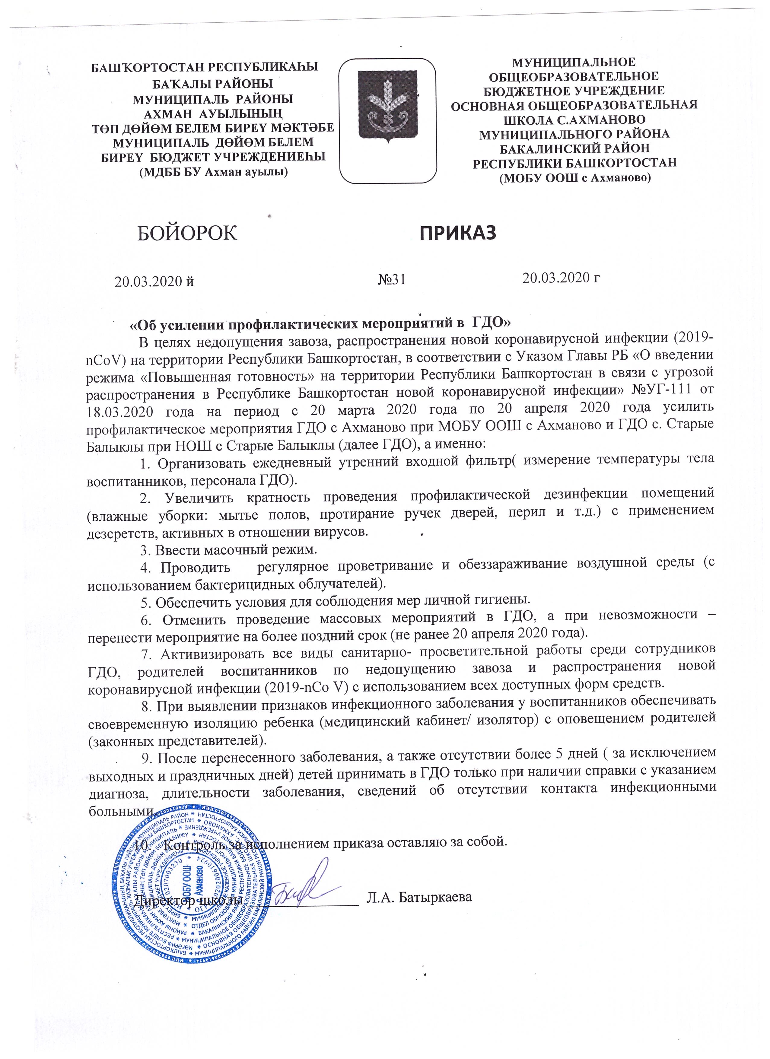 Мониторинг готовности МОБУ ООШ с Ахманово к переходу на дистанционное обучение | 20.03.2020 | Директор Батыркаева Л.А. | |